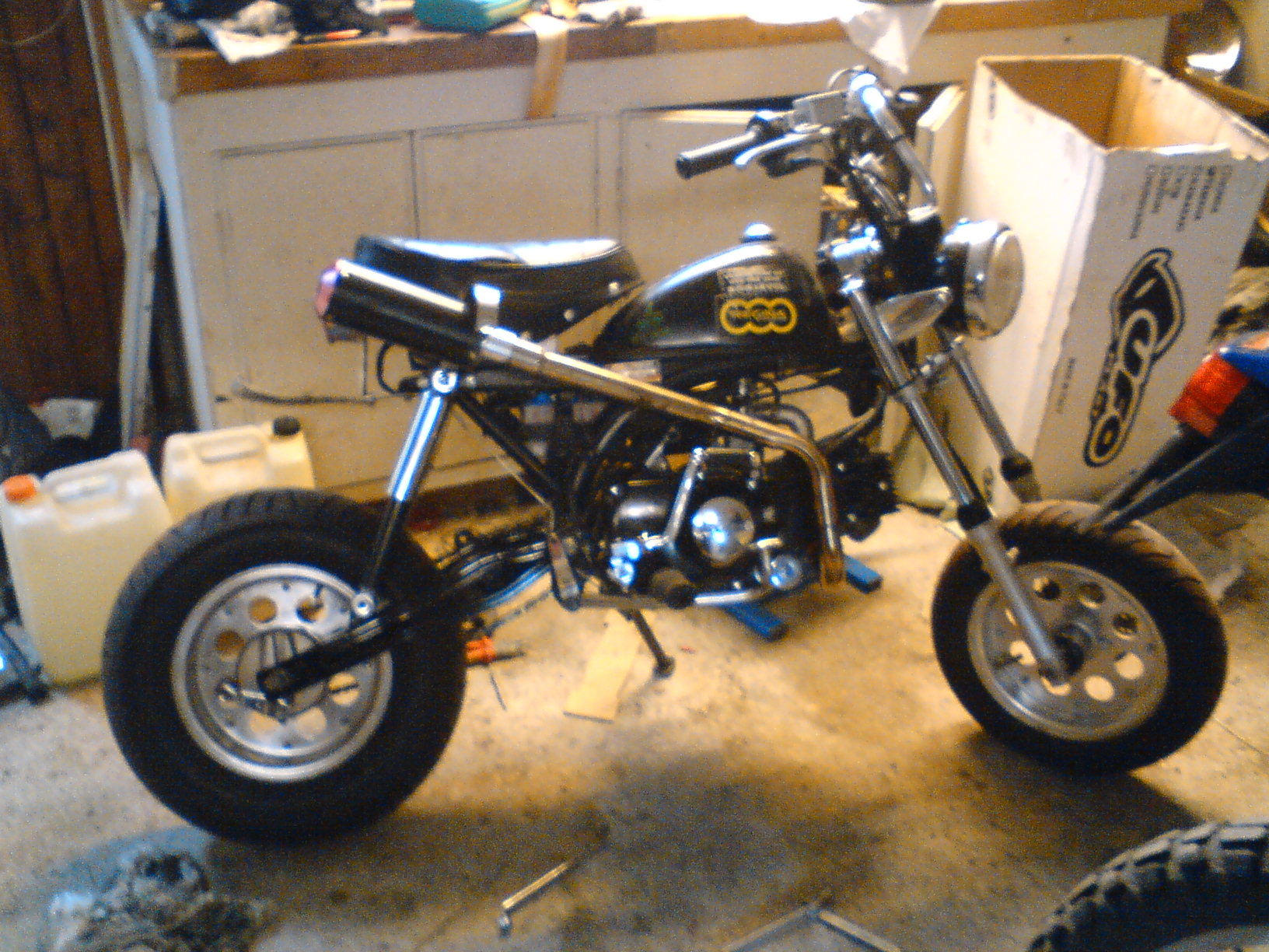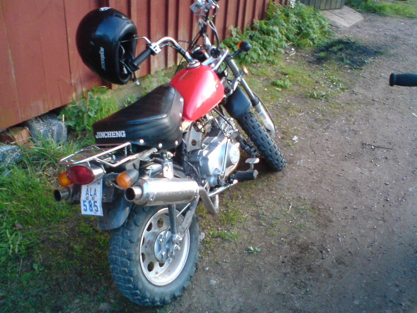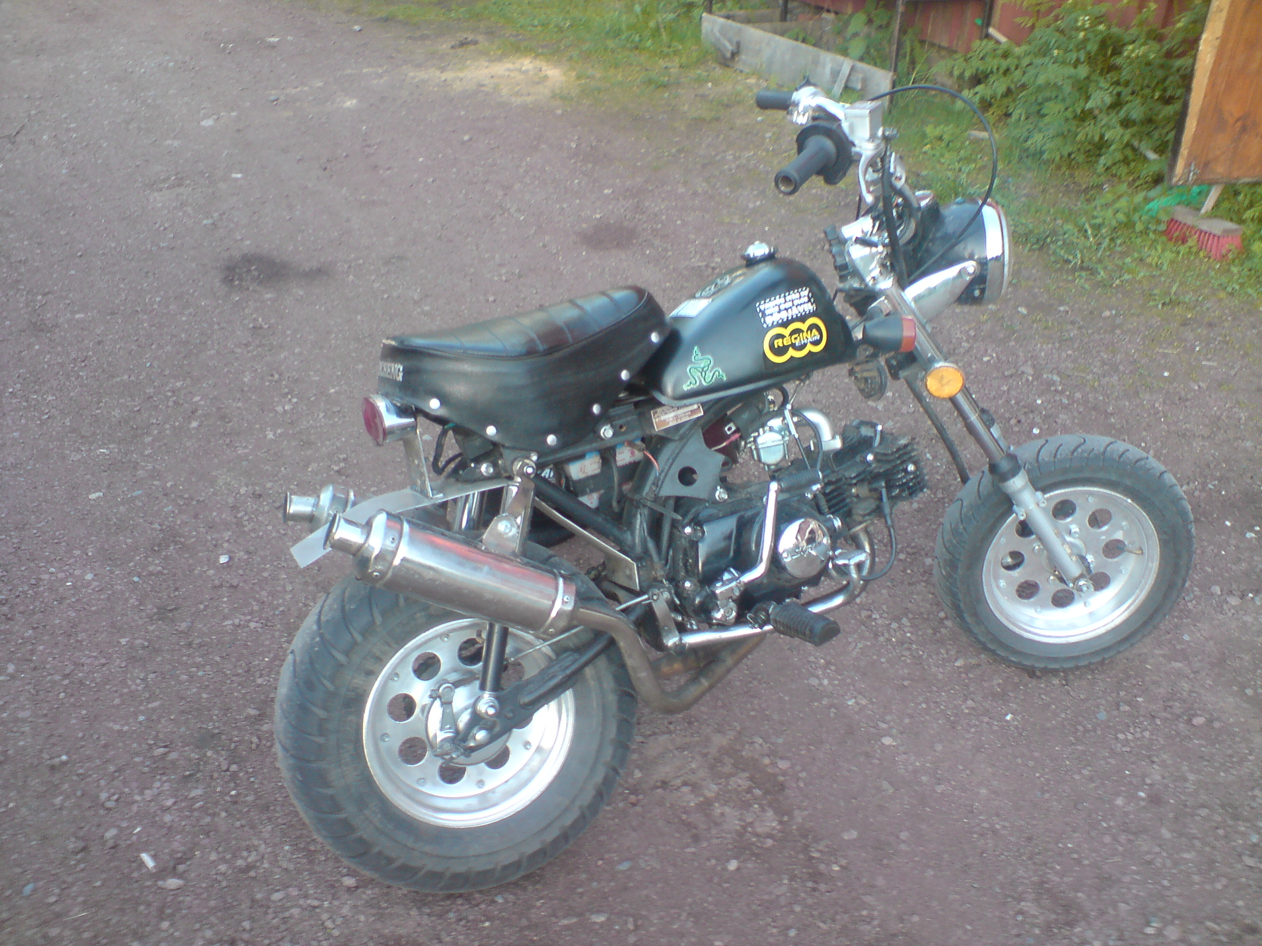 Det är en jincheng mod skyteam -06, dubbla avgasrör av märket skyteam, 10" alu fälgar, framdäck 90/90 bak 130/90. fiddy sving på nu, 30ans bakdrev, skivbroms fram, xtra lång gaffel med nya stefor i, har pressat in 2 lager på krass sidan av navet så att de ska hålla för lite mera effekt. En svart orginal honda tank på nu, egentilverkad bakstänka i 2mm alu. Fick upp den i 117km/h förra vintern med vinterdäck & 3ventilig 107ccm3 skyteam motor. Snabbgas är på som man knappt behöver röra. Just nu sitter det en orginal honda motor, har 2st xtra motorer en till honda o en jincheng (jincheng är de 80cc till, reservdels hondan är 50cc o halv aut). Har även en pitpro 3v 107cc med kamkedjan av och vipparna & kamaxeln är slut på grund av oljepumps haveri. gick igenom hela motorn för någon månad sen, bytte alla stefor och packningar allt är som nytt, kolv,cylle lager, etc. Ny tändkåpa till pitpron också. men givetvis har jag kvar alla orginal delar!, åkte tyvärr fast av polisen i somras. o de enda som behöver köpas till besiktningen är att köpa bromsrelä (ca 10€) & större bakkrass. nya däck o den är precis som ny. säkert glömt ngt.