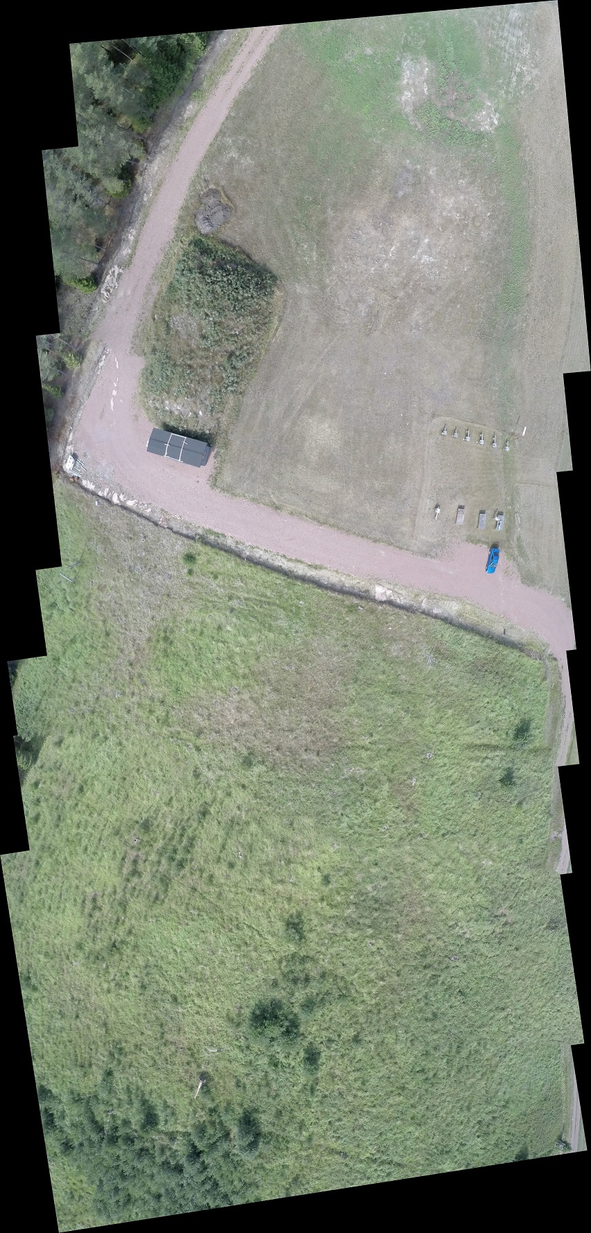 108 m var det ovan (avrundat till 100) och bilderna är 4000x3000, dvs 4:3. Höjden är alltså 75% av bredden, dvs 75% av 108m = 81 m. Och med 100 m är det 75 m. Njah, räcker inte. Måste flyga högre upp.