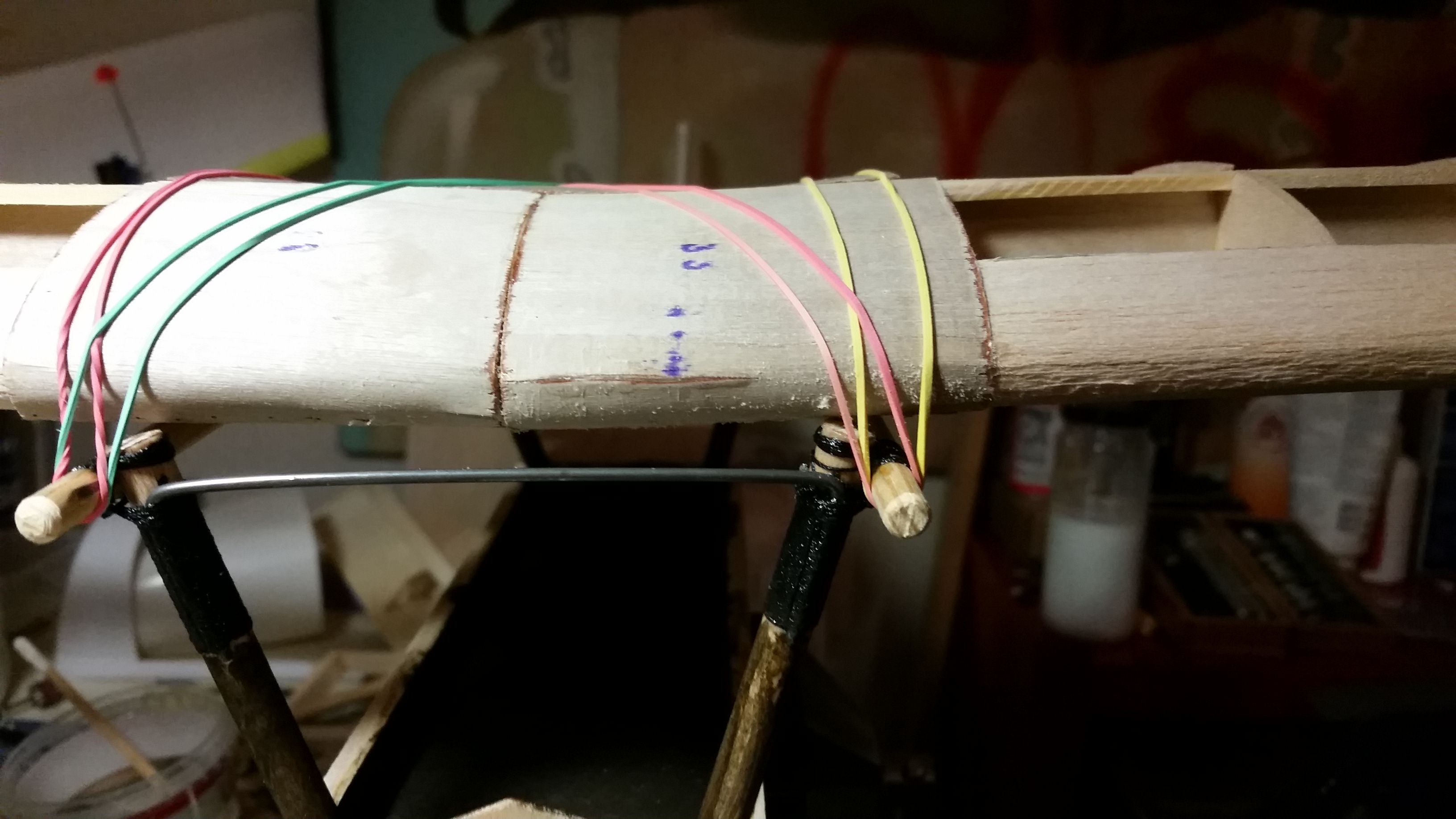 Sant, tejpen släpper, brukar bli minst ett varv för mig, för tejpen fastnar bra i sig själv. Är olika lim på tejp också, vissa lossnar när de blir rädda, andra håller fast för brinnkära livet. =) Jag har en bunt små nypor som är riktigt bra för balsabyggen. Såg att de hade såna på Dax och köpte en bunt, men dom var väldigt mycket kraftare, de nästan mosar plywood fast det är 5cm långa bara. Tvingor e bra. Man borde va bättre på använda block mellan bara. :-P