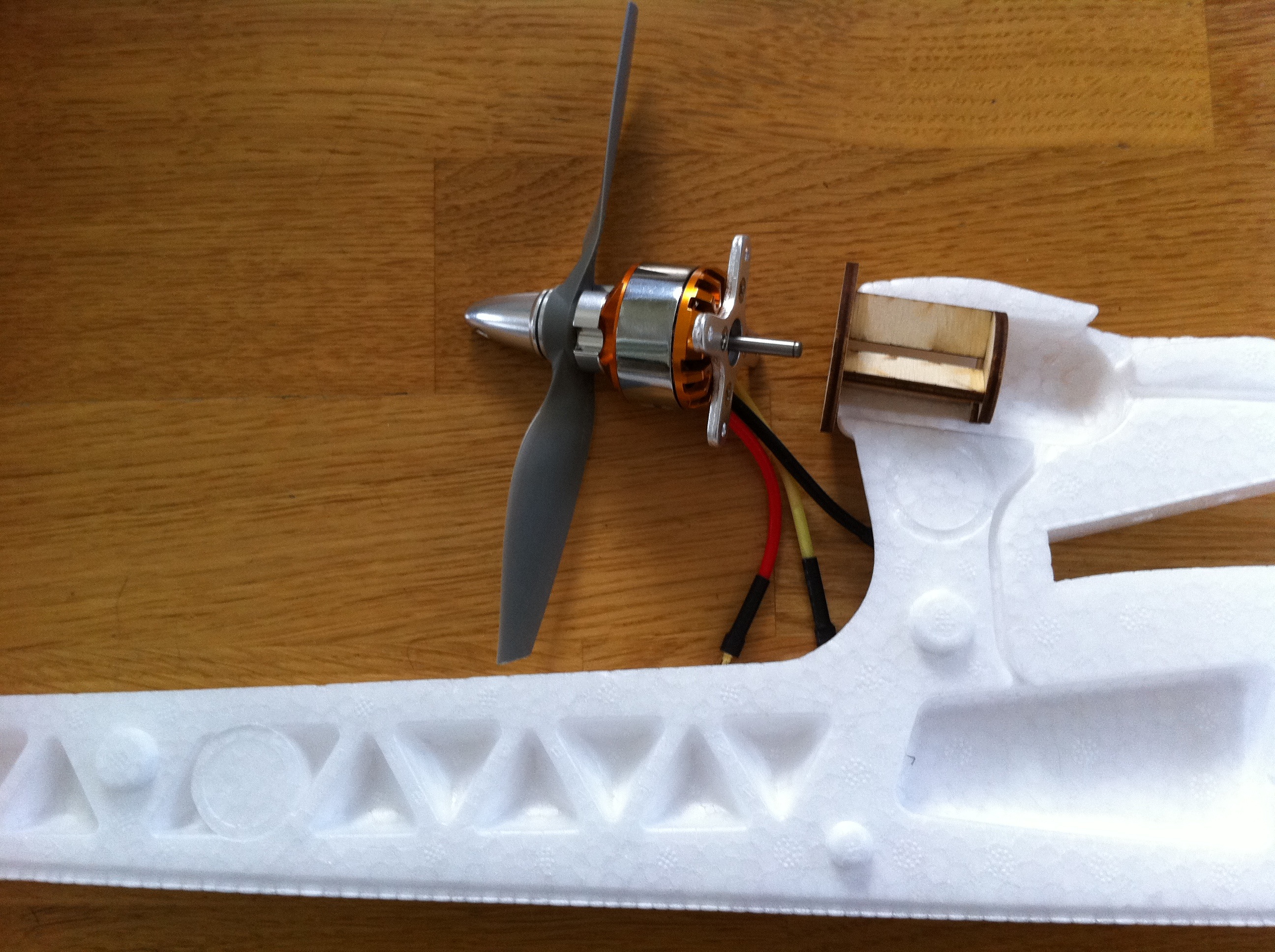 ...men nu har jag bara ett problem. Motorfastsättningens skruvhål avstånd från varandra är större än mountkittets diameter :( Så jag måste skaffa en bit plywood eller annat material och forma det samt limma fast det i mountkittet så jag kan få fast Turnigyn i den.