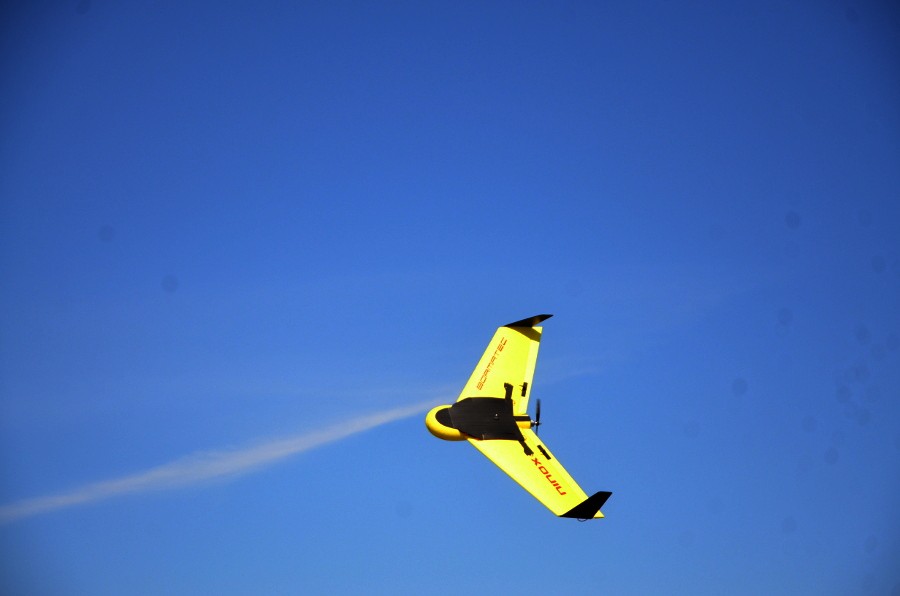 Den fotar rakt ner medans flyget själv flyger efter en förutbestämt rutt eller mönster. Detta lilla flyg klarar